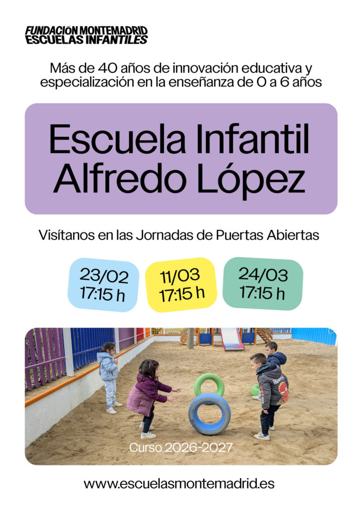 Desde la Escuela Infantil Alfredo López de Fundación Montemadrid, organizamos Jornadas de Puertas Abiertas presenciales para que podáis descubrir nuestro proyecto educativo, conocer al equipo que acompañará a vuestros hijos e hijas en esta primera etapa y recorrer los espacios en los que crecerán, aprenderán y se sentirán seguros.
