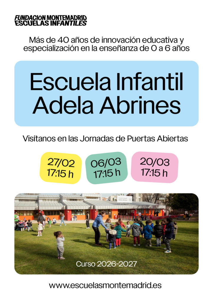 Desde la Escuela Infantil Adela Abrines, de Fundación Montemadrid, organizamos Jornadas de Puertas Abiertas presenciales para que podáis descubrir nuestro proyecto educativo, conocer al equipo que acompañará a vuestros hijos e hijas en esta primera etapa y recorrer los espacios en los que crecerán, aprenderán y se sentirán seguros.
